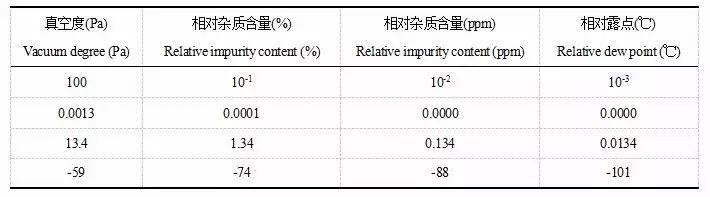 表1 真空度和相對雜質(zhì)含量及露點